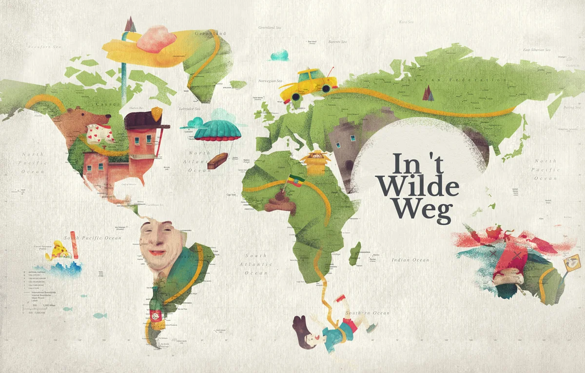 In 't Wilde Weg is a short story compilation of 15 travellers who tell their most crazy travel adventures. The book was written by two travellers that wanted to inspire everyone to travel more. They created a fun book to help visualise the situation and asked me to create a set of illustrations that summarises each story.